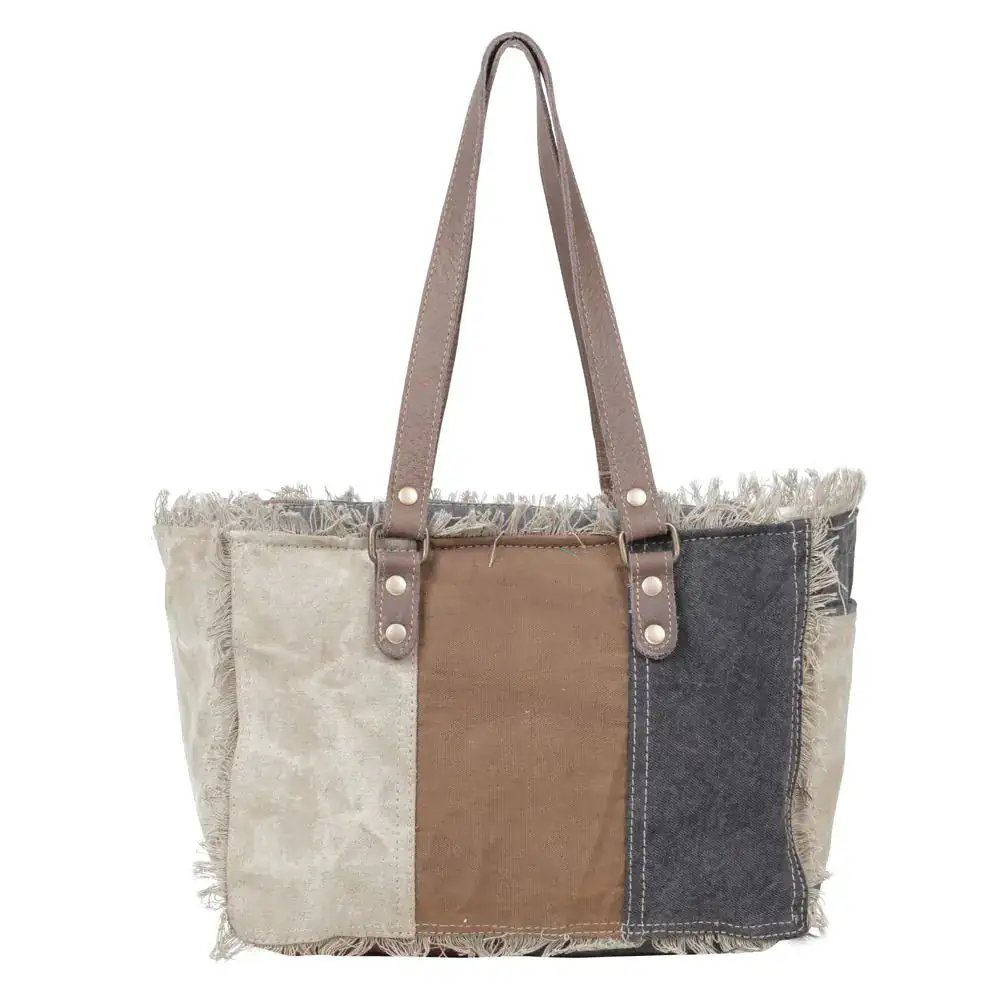 This cheerful bag is an eye-catcher with its neutral color and vintage-worn print as the focal point, accented with fringe trim on front and back. Leather trim and handles complete a classic look.