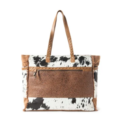 Adventure will always meet luxury in our statement weekender, featuring authentic hair-on hide in striking black and white, paired with richly embossed leather in timeless scroll patterns. Spacious enough for getaways, this ranch-inspired carryall combines rugged elegance with practical design for the sophisticated traveler.