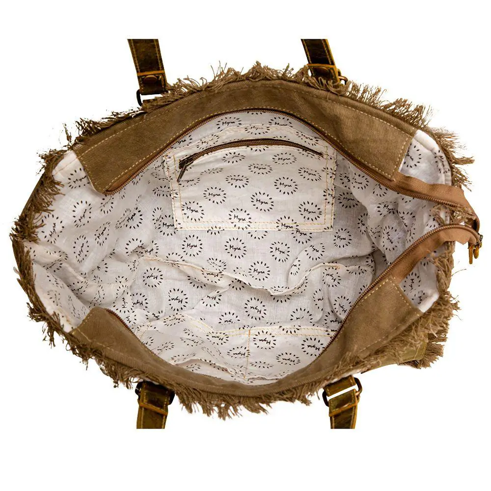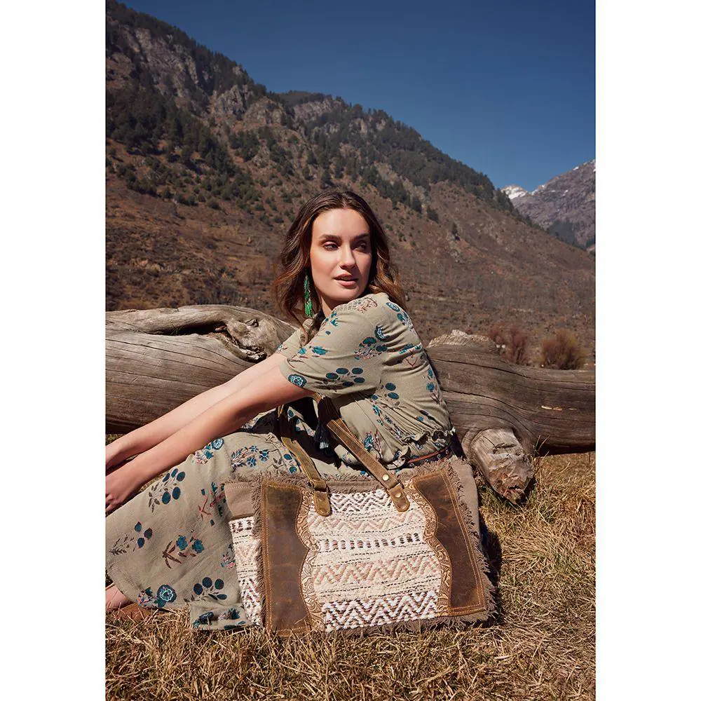 Earthy shades of upcycled rug framed by embossed leather trim and rugged solid leather sides have been carefully stitched together to make this style statement a reality.