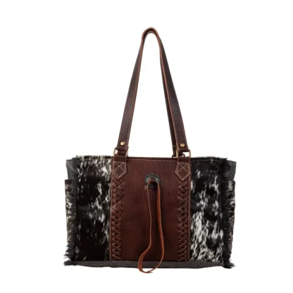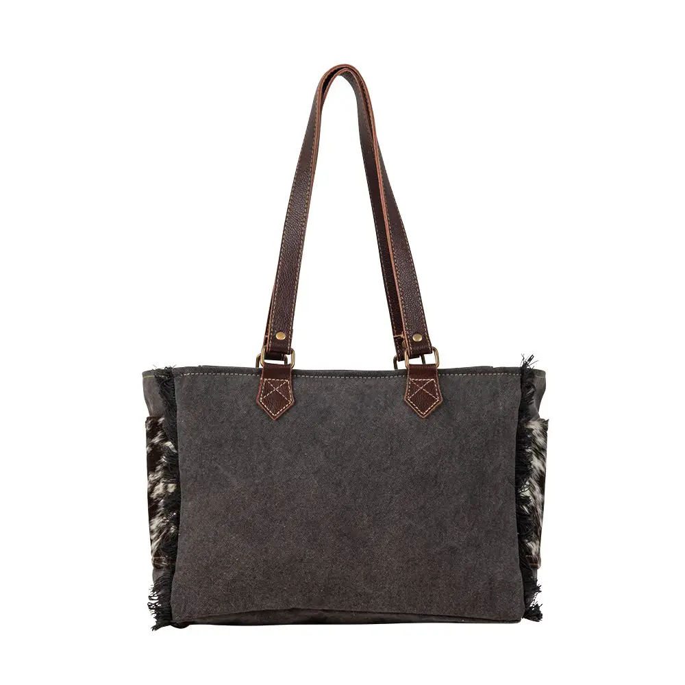 The classic, beautiful hair-on hide and front panel of chocolate leather make an incredible combination. The hair-on hide continues on the sides, while smoky charcoal woven canvas completes the back with frayed-edge seams.