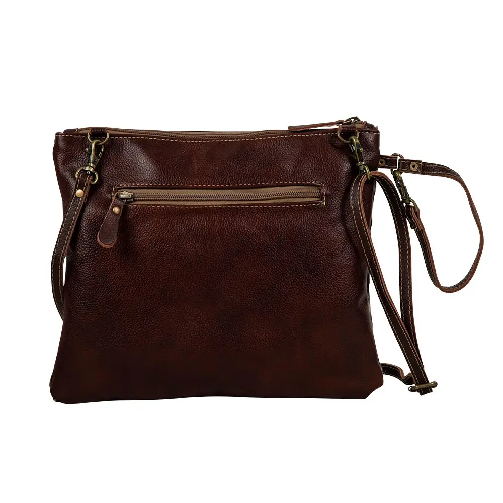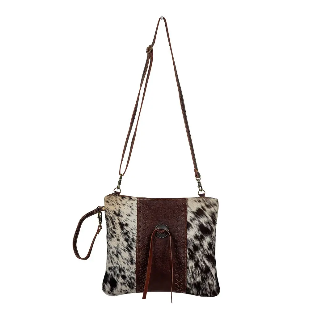 Gorgeous hair-on hide and a front panel of mahogany leather make a dynamic combination in this beautiful bag. Special stitching and a tassel accent complete the look. A zippered back pocket on solid leather add storage and completes the look.