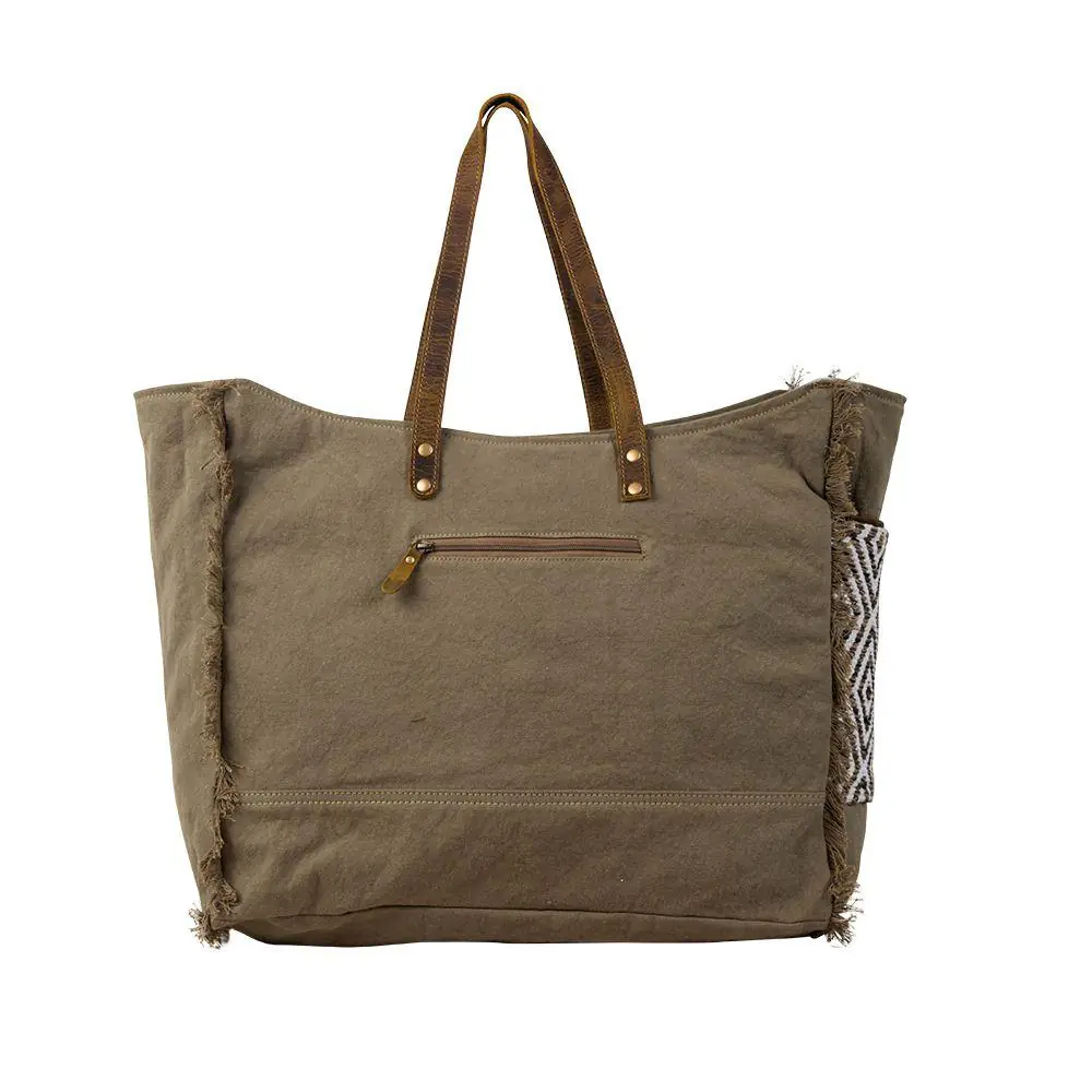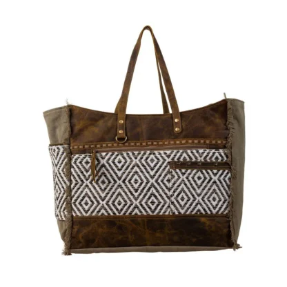 This beautiful bag features the signature upcycled woven rug from our Sand Weaver collection with a striking tribal-inspired pattern. The soothing colors are matched perfectly with special accents in rich chocolate leather. The back and sides are repurposed olive sandstone canvas with a frayed-edge treatment. The huge roomy interior is fully lined with cotton fabric features a zippered pocket and top zipper closure. Matching durable leather carrying handles.