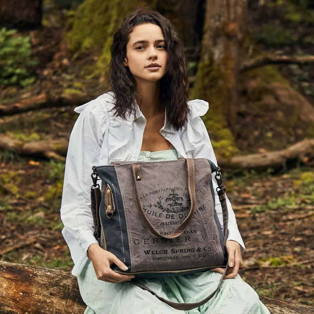 This distinctive bag is a durable navy blue and red-brown canvas tote, accented with a vintage-style French design, antique brass hardware, leather accents and handles and an adjustable, removable shoulder strap.
