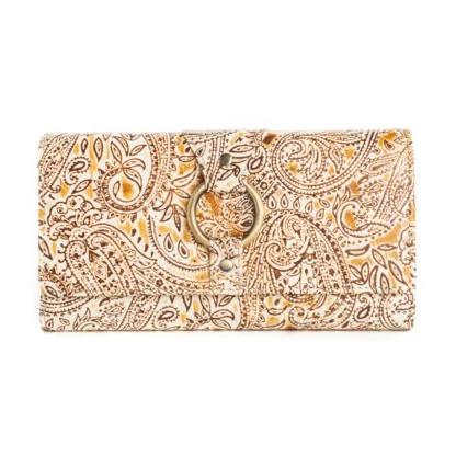 A true display of artisanal craftsmanship, this stunning wallet features intricate paisley embossing in rich desert hues, complemented by a classic brass ring closure. The sleek black interior offers practically designed card slots, an ID window, and a secure inside zipper pocket. Perfect for a cowgirl on the go, this wallet blends function with an undeniable elegance.